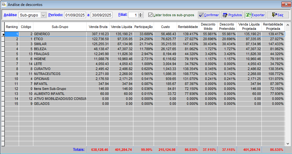 Nesta tela do Prosystem, após escolher um Grupo ou Subgrupo (ex.: Genérico), o sistema lista os produtos que pertencem somente a esse segmento, permitindo analisar: