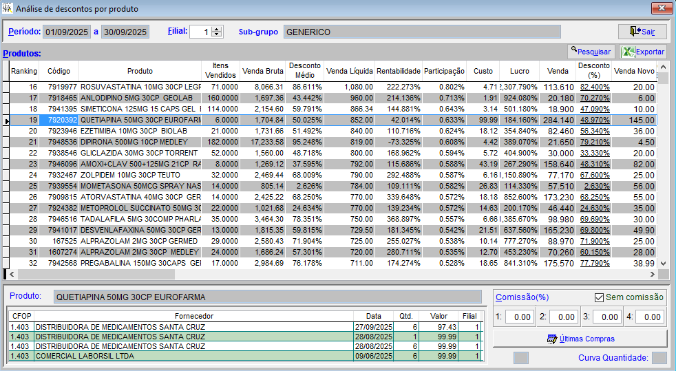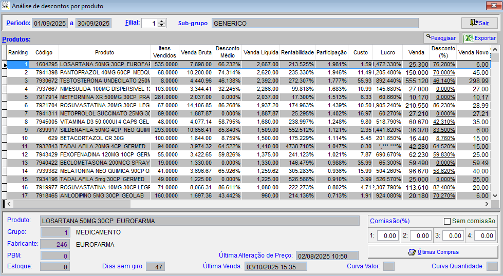 | LOSARTANA 50MG – 535 unid. vendidas | Alta venda, boa rentabilidade e desconto aceitável. Mantém o lucro do grupo. |