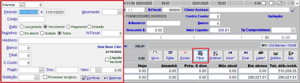 De acordo com o exemplo abaixo, irei filtrar todos os registros com o Vencimento entre 01/01/2025 e 31/01/2025 independente se estão Em aberto ou Quitados.