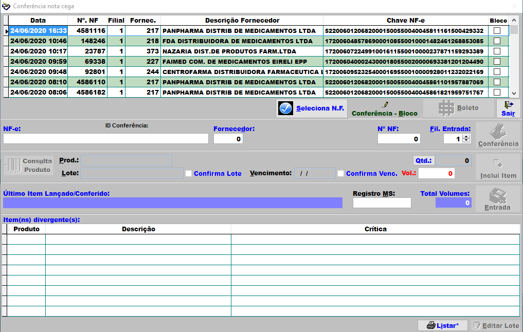 Após cadastrar as notas fiscais no sistema através do Gerencial ou através da importação do XML, optando pela opção de confirmar o estoque via nota cega, as notas ficarão pendentes para que possamos iniciar o processo de recebimento das mercadorias.