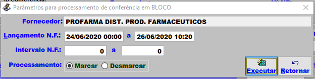 As notas podem ser conferidas individualmente ou em bloco. Para conferir individualmente, posicione sobre a nota a ser conferida e clique em "Seleciona NF", em seguida clique em "Conferência". Para realizar a conferência em bloco, de várias notas do mesmo fornecedor, posicione em cima de uma NF e clique em "Conferência - Bloco", a seguinte tela será aberta para que você informe os parâmetros para seleção. Observe: