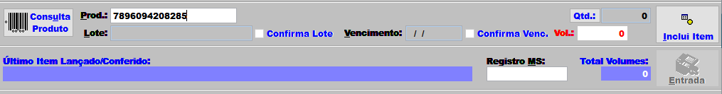 Quando a quantidade do produto bater com a quantidade da nota fiscal, um check azul irá aparecer ao lado do botão "Inclui Item", observe abaixo: