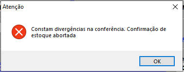 Após fazer a contagem de todos os itens, clique em "Entrada". Caso as quantidades informadas estejam de acordo com a nota fiscal, o processamento será finalizado e o estoque será alterado. Caso tenha divergência na conferência, a seguinte mensagem será exibida: