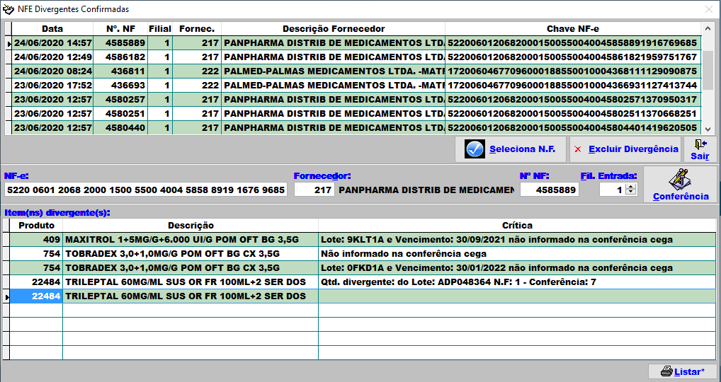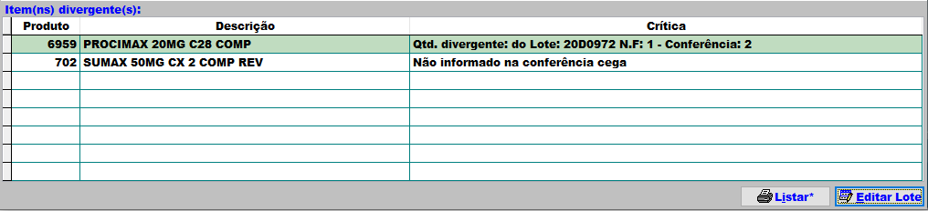 Os itens divergentes serão exibidos na grid inferior, sendo possível corrigir as quantidades mediante senha do usuário. Para corrigir as divergências, basta clicar em "Editar Lote" quando for um produto controlado, ou "Editar Qtd" quando for um produto liberado. Veja exemplo abaixo: