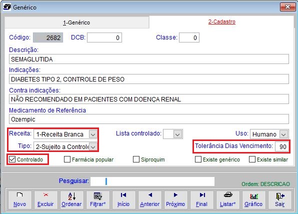 Primeiramente, a substância deve estar cadastrada em Auxiliares > Genérico, caso não tenha cadastro, clique em novo e preencha os campos necessários. Marque o checkbox "Controlado", informe o tipo "2-Sujeito a Controle Especial", e com Tolerância Dias Vencimento = 90 dias. No campo Lista Controlado deixe em branco.